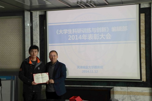 经编辑部推选,制冷及低温技术系 2012 级郭雨辰、生物工程 2011 级刘林两位同学获beat365官网 2013-2014 年度优秀学生编辑纪念奖。计宏伟副处长为获奖同学颁发了奖品和获奖证书。