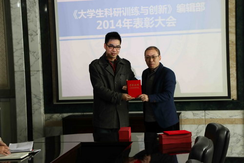 《学生科研训练与创新》(原《 SRT 在行动》)创刊于 2006 年教师节,经过八年多的探索与实践,目前该刊已成为在老师指导下,主要由学生自己策划、组稿、编辑出版,主要刊载学生自己参与 SRT (含 G-SRT )计划项目、“国创”计划项目及各级各类学科竞赛等科研活动的感受和体会,备受全校学生爱读、争先恐后阅读的刊物。为进一步加强学生编辑部队伍建设,不断提升办刊质量,教务处决定每年对为该期刊做出突出成绩的编辑同学进行表彰。会上,计宏伟副处长首先对编辑部全体编辑同学的辛勤工作及取得的成绩给予充分肯定。同时指出,《学生科研训练与创新》这个刊物是在老师指导下,主要由学生自己策划、组稿、编辑、校对完成的,在某种意义上讲,它既是一种宣传,也是一种指导式管理的大胆尝试。实践证明:这种指导式的管理模式为学生参与学校管理搭建了很好的交流平台,更容易为广大学生理解和接受。此外,就《学生科研训练与创新》期刊今后的功能定位、栏目设计等问题教务处提出了具体的指导性建议: