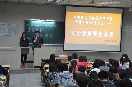 为增强大学生的安全防范意识,提高安全防范能力,11 月 26 日晚,生物技术与食品科学学院在4 号教学楼 506 教室召开安全意识强化讲座, 2012 、 2013 、 2014 级各专业班级的班长、团支书和生活委员参加。
