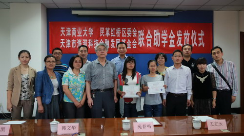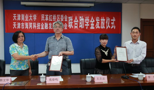 9月25 日下午,在校图书馆弘毅厅举行了民革红桥区委、 天津市海河科技金融发展基金会联合助学金发放仪式。民革天津市委副主任委员、民革红桥区主任委员苑春鸣,天津市海河科技金融发展基金会副秘书长李伟出席助学金发放仪式并为获奖学生颁发证书。beat365英国官方网站统战部长王立云,学生处副处长孟国栋,红桥区统战部副部长韩文华,红桥区统战部党派工商科科长赵凯及相关学院的领导、部分学生代表参加发放仪式。