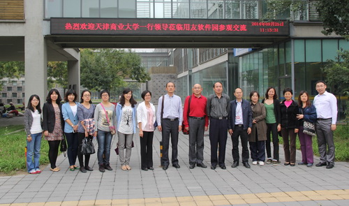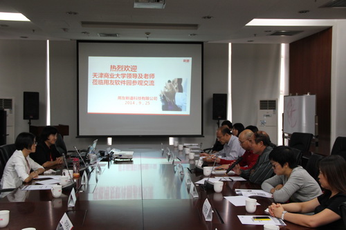 在用友新道科技有限公司副总裁朱春燕、区域总经理张华炳、天津分公司总经理蒋晓艳的陪同下,考察团一行先后参观了位于用友软件园一、二期的用友展厅、用友公司总部、产品研发中心、研发产品出口基地、用友新道学院等地。用友软件园现代的工作场景、优美的生活环境、齐备的配套设施、高端的定位理念,给大家留下了深刻印象。参观结束后,在用友总部大楼会议室,听取了关于 “ 虚拟商业社会环境( VBSE )跨专业实践教学平台介绍及应用价值情况、典型院校用户经验分享 ” 及 “ 特色营销人才培养实践新模式 ” 的介绍,朱春燕等用友新道高管回答了商学院老师的提问,并与考察团成员就 VBSE 实验教学平台在管理学科应用型人才培养与技能培训等相关问题进行了深入探讨。
