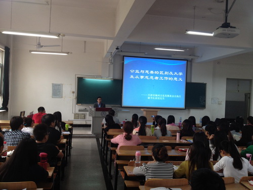 签约仪式后,崔欣先生为 2012 级行政管理专业的同学们做了题为“公益与慈善的区别以及大学生从事志愿者服务的意义”的主题报告。在报告会上,崔欣先生不仅详细介绍了天津市海河文化发展基金会的组织与运作情况,帮助同学们更好地了解公益组织的发展特点,而且从志愿者服务的视角提出了大学生从事公益活动对职业规划的重要意义。演讲结束后,崔欣先生还与同学们进行了现场互动,热情回应了同学们提出的各种问题。报告会结束后,同学们纷纷表示,对公益组织和志愿者服务工作有了更深层的了解,受益匪浅。