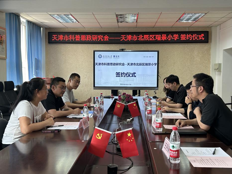 梁强、唐文广向瑞景小学的师生们介绍了理学院教学科研、社会服务成果及学科发展规划,阐述了大中小幼科普思政一体化工作的意义,以及整合各级学校课程、师资和实践等资源优势,深入推进科普教育创新发展的思路。会上,天津市科普思政研究会与北辰区瑞景小学签署共建大中小幼科普思政一体化实践基地协议。