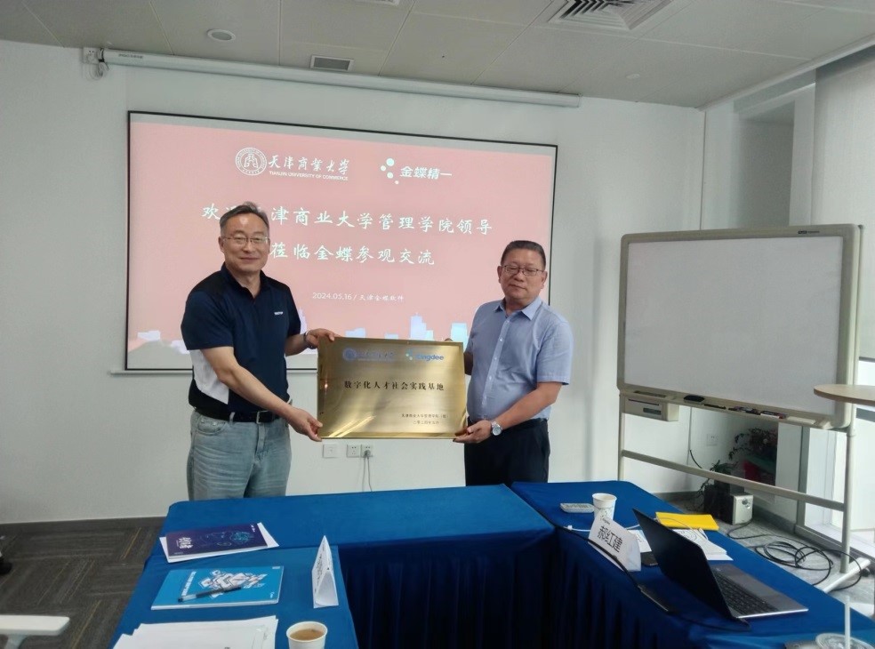 金蝶精一公司副总裁乐志军介绍了公司发展情况,李耘涛介绍了管理学院的总体概况、学科发展、人才培养及服务社会情况,与会人员就校企合作模式展开深入交流。庞文生指出,学校人才培养要与社会需求对接,针对校企双方合作模式给出了方向和建议。同时,代表学院与企业签订了校企合作协议。与会领导共同为数字化人才社会实践基地授牌。