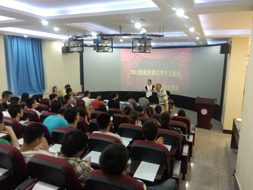 随着大类分专业的结束,为了使 2012 级工商管理类选入旅游管理、酒店管理专业的学生更好的了解专业情况,打消顾虑,快乐学习,更好的融入旅游、酒店这个大家庭,5月26日,旅游酒店学生党支部携手旅游管理系教工党支部、酒店管理系教工党支部共同为 2012 级的 100 名学生举行了专业师生见面会。会议在 5 号教学楼一楼商学院旅游系景区与导游虚拟管理实验室举行。酒店管理系系主任李志刚老师,旅游管理系系主任胡宇橙老师,旅游管理系教工党支部书记、 12 级旅游管理专业班主任冉群超老师, 12 级酒店管理专业班主任陈媛媛老师及旅酒系党支部、团总支、学生会主要负责人出席。会议由院学工办副主任、旅游酒店系辅导员曹静主持。