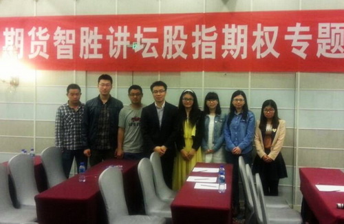 4 月 20 日 下午, 2013 级证券期货联合培养硕士班学员同招商银行天津分行、招商证券天津营业部部分职员一起在金皇大厦会议厅听取期货及期权交易讲座。主讲老师蒋毅来自招商证券总部,拥有 5 年期货实盘操作经验,他以其自身交易经历和感悟向听众们讲述了期货(尤其是股指期货)交易的注意事项和要点,见解独到,引人深思。