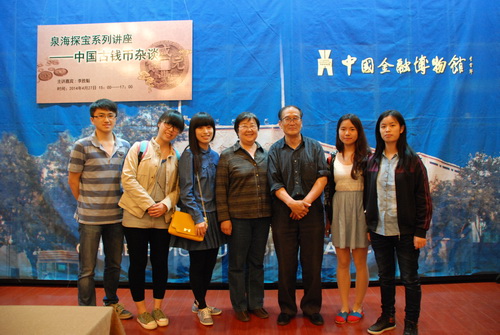4 月 2 7 日下午,经济学院 2013 级金融学专业部分研究生、金融 1105 班(财富管理方向)部分本科生参与了在beat365官网实践教学基地——中国金融博物馆举办的“泉海探宝系列活动之二:中国古钱币杂谈”讲座,活动由中国金融博物馆与天津钱币学会联合举办,人民网天津协办。本活动由白丽华馆长主持,主讲嘉宾是在天津金皇艺术品鉴定中心担任古钱币鉴定工作的李胜魁先生。