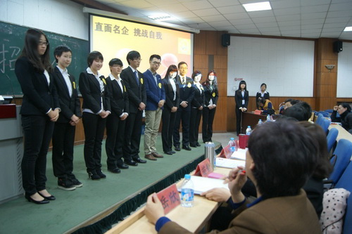 为培养毕业生积极健康的求职观,进一步提升求职能力,商学院就业服务委员会主办了职场招聘会暨毕业生求职挑战赛。 11 月 27 日晚,商学院在 3 教 110 室举行决赛,决赛企业评委有周大福珠宝金行有限公司天津办公室高级主任李红霞、天津永和大王餐饮有限公司开发经理穆瑞增、天津百盛商业发展有限公司人力资源部主任周维、内蒙古伊利实业集团股份有限公司液态奶事业部招聘主管苗静、天津滨江万丽酒店人力资源部经理岳欣,学院党委副书记翟云锋、学生工作办公室主任赵欣等。