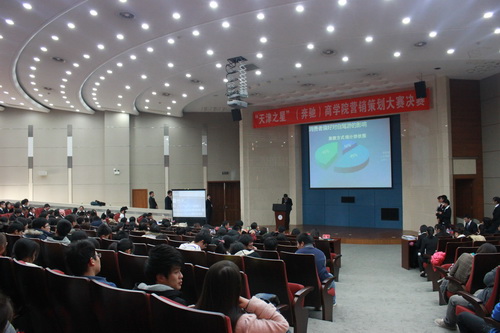 12 月6 日下午,决赛在图书馆三楼国际报告厅举行,商学院市场营销系和工商管理系的专业教师担当评委。决赛中, 15 支队伍依次从品牌营销、产品营销、客户营销、赞助营销等四个方向分别阐述其营销策划案的目的、意义、技术支持、后期操作以及资金预算。针对现场评委提出的问题,各个团队分别从产品特点、市场营销状况及其所处的优劣势做详细介绍并指明解决策略。不论是冰镇菜鸟队的手机,成双成对组合的福田风景系列汽车,还是 SUM(X) 队的蜡烛,五个夸父队的房车,各队都从不同的视角入手,分析其营销策划理念,给人留下深刻印象。最终 Max 团队荣获一等奖; Everest 团队和洋葱数字团队荣获二等奖; Smart Forthree 团队、追梦队和 SUM(X) 团队荣获三等奖; DMS 团队、五个夸父团队和艺匠团队荣获优秀奖,共获得天津之星奖金五万元。