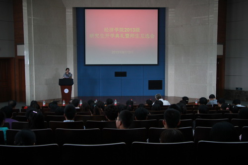 经济学院2013 级研究生开学典礼暨师生互选会于9 月13日上午在图书馆三楼国际报告厅举行。院长刘小军、院党委书记肖培荣、党委副书记张玉娟及各专业硕士点负责人和导师参加。副院长巫建国主持。