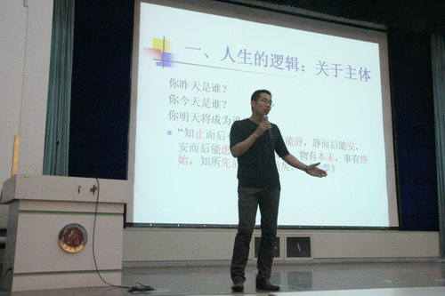 王老师讲到,大学生第一要学习人生的逻辑——关于主体和学习。首先,针对关于主体,王老师提出三大问题:你昨天是谁?你今天是谁?你明天将要成为谁?在解答这三个问题时,王富强老师强调要觉察自我。其次,关于学习,王老师点明新生要明确三点:为谁学?为什么学?学什么?怎么学?就这三点王老师说到人要有目标才能愉快过生活、要通过学知识练习自己的思维能力、要整理好自己的学习心态。第二是人生的目的——关于幸福感。王老师与同学们分享了 10 条关于幸福的秘诀 : 遵从内心的热情,选择你有意义的事;多与朋友在一起;学会接受各种状况;全然接受自己;简化生活;有规律的锻炼;睡眠;慷慨;勇敢以及学会去表达感激。第三是人生的目标——关于平衡。王老师展示了他制作的以幸福为核心由朋友、家庭、健康、财富、事业、休闲、成长等拼成的幸福平衡轮。第四是人生的过程——关于成长。王老师主要提到了七点:视野开阔、思维合理、意志坚定、心态积极、知行合一、身体健美、充满正能量。