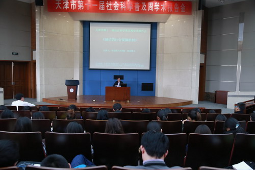 10 月23 日下午,主题为“诚信的社会保障机制”的专题报告会在图书馆三楼学术报告厅举行,主讲人为马克思主义学院杨东博士。这是由天津市委宣传部、天津市社会科学联合会主办,beat365官网党委宣传部与信息工程学院党委共同组织实施的天津市第十一届社会科学普及周第二场学术报告会。报告会由宣传部副部长于俊如主持,信息工程学院 300 余名学生聆听报告。