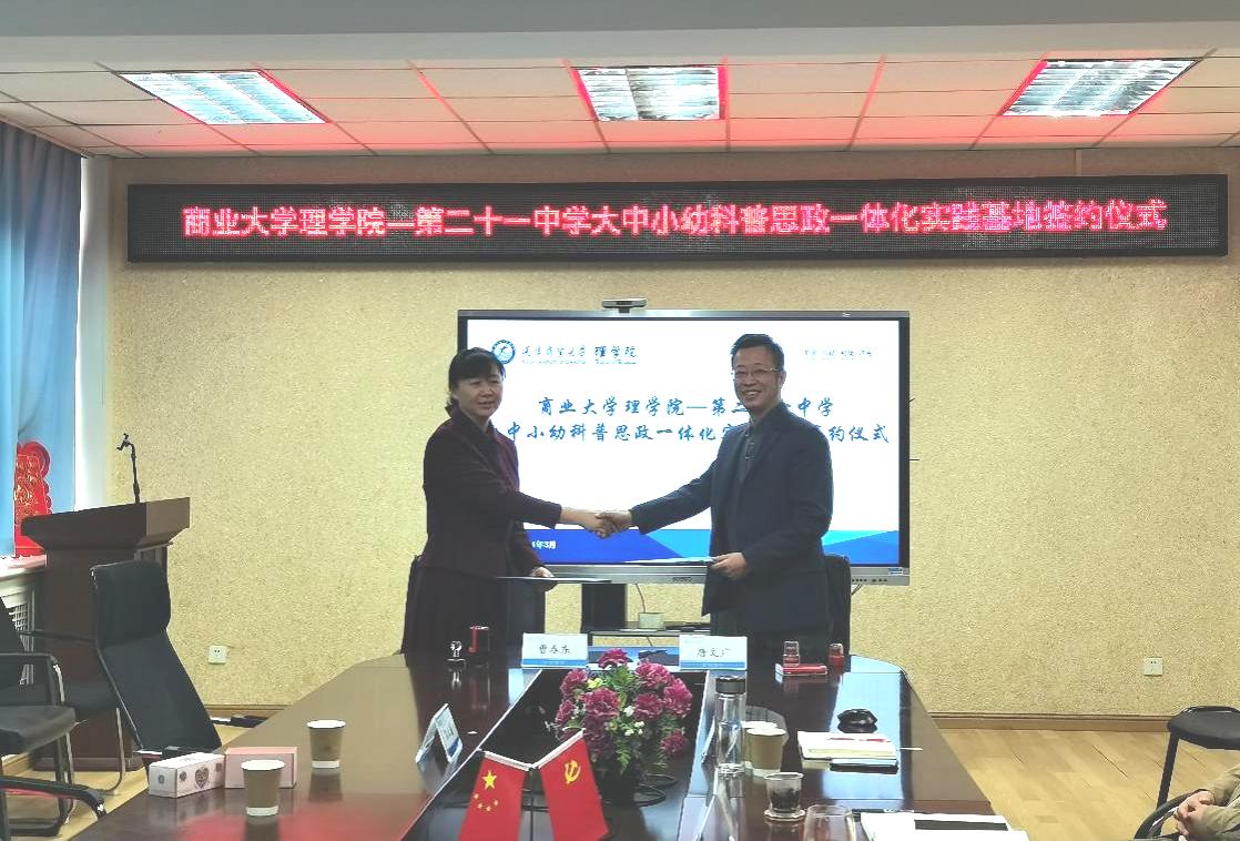 3月4日下午,理学院与天津市第二十一中学签订大中小幼科普思政一体化实践基地共建协议。理学院党委书记梁强、院长唐文广、副院长周严、天津市第二十一中学副校长曹春东及双方教师代表参加。