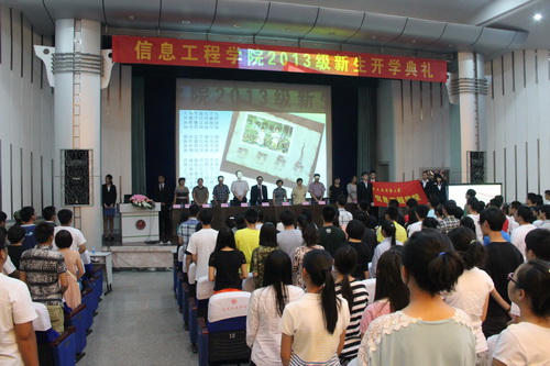 9 月 11 日晚,信息工程学院在学术交流中心隆重举行 2013 级新生开学典礼。学院院长潘旭华、院党委副书记王艳军、副院长陈雷、各系主任等出席典礼。全体新生班主任、专业辅导员、新生助理班主任、学生干部代表和全体 2013 级新生参加了典礼。