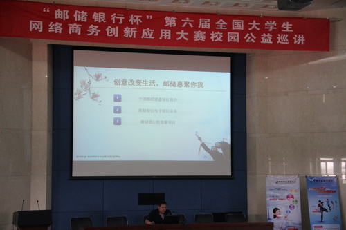 5 月24 日 下午,信息工程学院在图书馆报告厅举办 “ 邮储银行杯”第六届全国大学生网络商务创新应用大赛校园公益巡讲。院党委书记刘振航教授、院长潘旭华教授、院党委副书记王艳军、副院长陈雷、中国邮政储蓄银行天津分行管理部电子银行主管韩莹莹女士等出席活动。 2011 级、 2010 级电子商务等 4 个专业学生参加巡讲活动。