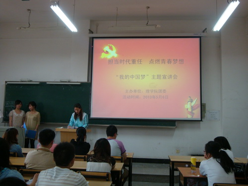 近日,为深入学习贯彻党的十八大精神,理解中国梦内涵,理学院团委主办了“担当时代重任 点燃青春梦想——我的中国梦”主题宣讲会。理学院团委书记、团学干部及全体团支部书记出席本次活动。
