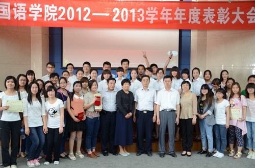 5 月29 日下午,外国语学院2012-2013 学年度表彰大会在图书馆三楼报告厅举行。外国语学院副院长王永祥副教授、副院长王占斌教授、党总支副书记骆媛、英语、日语系全体教师应邀出席。