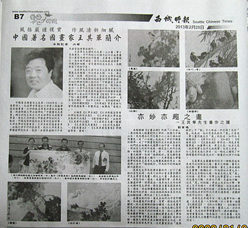 2 月 28 日 ,美国西雅图《西城时报》 专题刊登了艺术学院王其华教授作品。整版报纸选用了王其华先生较具代表性的六幅绘画作品,并有《亦妙亦趣之画——王其华先生画作之议》一文细细鉴赏了王其华院长的作品。
