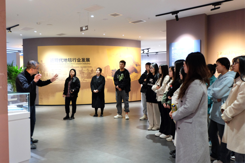研学第一站,同学们参观了“织采宫——崔黄口国际地毯文化展览馆”。崔黄口国际地毯文化展览馆的负责人生动地介绍了手工地毯的织作技艺和多彩图案纹样,引领同学们观看了地毯宣传片,深入了解了崔黄口地毯的辉煌发展历程。这一过程让大家深刻领略到地毯产业所蕴含的“工匠精神”,见证了一代又一代地毯工匠坚守匠心的艰辛历程,以及天津悠久而厚重的人文历史。
