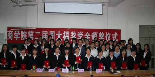 继2011 年出资 15 万元奖励商学院 30 名优秀学生后, 2012 年,周大福珠宝金行有限公司再次出资 22.5 万元奖励学院 45 名品学兼优的学生。在周大福奖学金颁发仪式上,谢浩然经理介绍了周大福公司的发展历史以及品牌效应。周大福奖学金的设立,就是公司依据自身用人需求和学院协商,共同培养人才的重要举措。翟云锋副书记感谢周大福公司为学校人才培养搭建的平台,并希望学生利用好平台尽快成长为社会急需的人才,希望获奖学生发挥榜样作用,激励全院学生成长成才。
