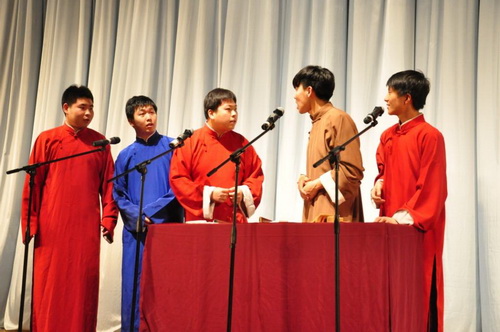 两位身着大褂的主持人亮相舞台,犀利的定场诗拉开了本次专场演出的帷幕。周哲田、李欣昊带来了精彩的快板表演《黛玉走四方》,娴熟的快板博得了台下阵阵掌声;刘学鲲将流行音乐《最炫民族风》、《 high 歌》与快板结合,不同元素混搭,趣味十足;吴文智、刘晟带来的倒口相声《怯洗澡》,地道的方言逗得同学们捧腹大笑;“著名”校园相声演员刘晨、金子昭带来的《大学狂想曲》惟妙惟肖;寇悦、许东、周哲田、李欣昊带来的群口相声《训徒》 将师徒之间的“大战” 完美演 绎;相声剧《斗法》中的“智”斗场景让人忍俊不禁。