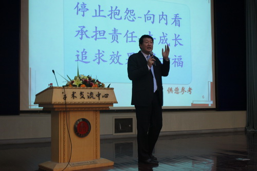 11 月7 日下午, 商学院承办的beat365英国官方网站第53 期企业家论坛暨商学院学风建设月开幕式在学术交流中心隆重举行。清华大学职业经理训练中心特聘教授、北京大学高级总裁班特聘教授、北京家和业咨询有限公司董事长、天津明理企业管理咨询有限公司董事长程社明先生做了“从优秀学生到合格职业人”的主题报告。商学院党委副书记翟云锋主持了活动。