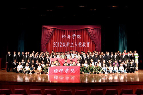 新生入党教育在庄严的国歌声中开始。张玉娟副书记首先致辞,她希望全体 2012 级学生以优秀学生党员为榜样,严格要求自己,立志报国,早日成才。经济学院党建办公室向新同学具体介绍学院党建组织结构、入党流程;接着对学院“七一”创先争优活动中评出的 20 名优秀学生党员进行了表彰。最后,经济学院党委书记肖培荣总结发言,她希望全体党员、入党积极分子要端正入党动机,认真刻苦学习,脚踏实地工作,勤俭节约生活。她要求广大青年学生在入学关键期,要做好学业规划,加强思想修养,心怀祖国,服务社会,争取早日加入党组织。活动中,经济学院团委国旗班的表演、青协的手语表演《爱的翅膀》以及学生会的小合唱《英雄赞歌》都给人留下了深刻的印象。