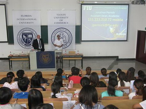 为使2010级学生适应 FIU 教学模式, TUC-FIU 合作学院于 8 月 19 日 举办了 2010 级学生学习导向会。在此次学习导向会上, FIU 相关教师各自向学生介绍了新的学业阶段的基本情况。负责 FIU 学业指导的申梦老师向学生介绍了 FIU 学术制度等信息,负责 IT 实验室管理的王福存老师和 FIU 教授王宏业老师向学生介绍了 FIU 网站资源, FIU 助理院长 Jonathan Pernick 向学生介绍了 FIU 学术标准及如何取得学术成功, FIU 学生服务协调员 Joe Vazquez 向学生介绍了赴美留学的机会。