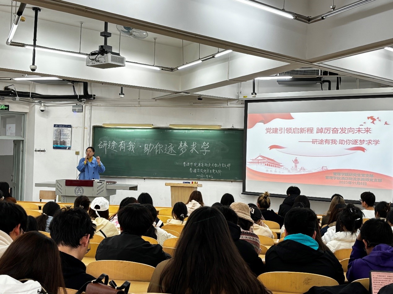 11月8日下午,管理学院研究生党支部、酒店物流系教师党支部组织开展“党建引领启新程 踔厉奋发向未来---研途有我,助你逐梦求学”考研经验交流分享会。院党委副书记沈洁、研究生党支部和酒店物流系教师党支部党员、本科生200余人参加活动。