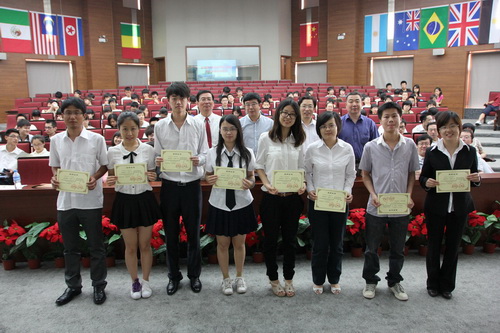 潘旭华副院长主持大会,他说,多年来,学院按照学校“商学素养与专业能力结合、知识学习与实践能力并重、诚信做人与创新能力兼备,培养复合型创业型应用人才”的育人理念,在校教务处的大力支持下,我们一直致力于组织越来越多的学生参加各类高水平的全国性大学生赛事,在本次大会上获得表彰的仅仅是参加2011年度各类全国比赛的获奖师生;2011年度,我们参赛并获奖的赛事包括:“E路通”杯首届海峡两岸大学生网络商务创新应用大赛、第二届中国大学生服务外包创新应用大赛、第三届全国大学生电子商务“创新、创意及创业”挑战赛成都“国际商贸城”杯总决赛和全国大学生电子设计竞赛等等;我们在对大家表示祝贺的同时,希望老师和同学们再接再厉,不断攀登新的高峰。