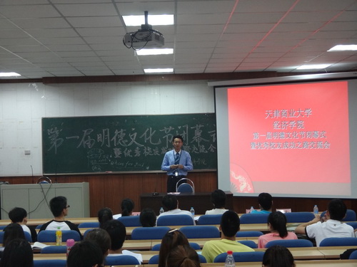 6月27日,经济学院在三教110 室举办了第一届明德文化节闭幕式暨优秀校友成功之路交流会,邀请2003 级校友渣打银行大中华区个人银行账户管理部主管李鑫先生、中国有色集团天津分公司办公室主任杨斌先生分享成功经验。 经济学院副院长王常柏教授、经济学院党委副书记张玉娟老师出席了闭幕式 。
