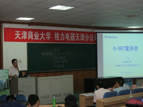beat365官网与天津盛世欣兴格力电器贸易有限公司(以下简称格力公司) 合作举办的 " G-SRT" 计划项目宣讲会 ,于 6 月 29 日下午在三号教学楼 110 室举行。出席此次宣讲会的有教务处副处长曹军、机械学院党 委副书记刘振强、艺术学院党总支副书记梁强、机械学院制冷系主任郭宪民教授、高级工程师杨永安,格力公司中央空调部部长孙奇、副部长方培、行政部部长何慧,参加宣讲会的还有对此项目有意向的机械学院、艺术学院、设计学院近 200 名学生。