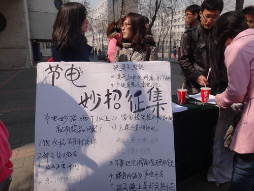 3月12日,通过现场摆展板的形式,向全校同学征集节电小妙招,普及节约用电的理念和方法,帮助同学们在以后的日常生活中加以运用,多加注意,避免不必要的浪费。