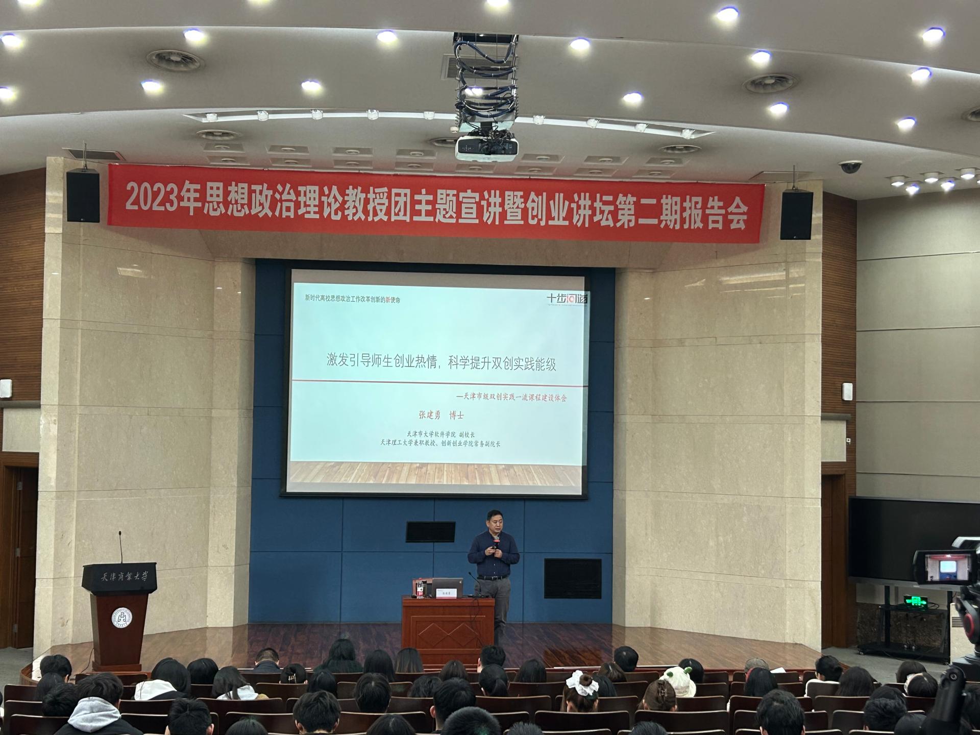 11月22日下午,党委学工部在图书馆国际报告厅举办2023年思想政治理论教授团主题宣讲暨创业讲坛第二期报告会,天津市大学软件学院副院长张建勇应邀作主题宣讲。各学院师生代表300余人聆听讲座。