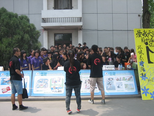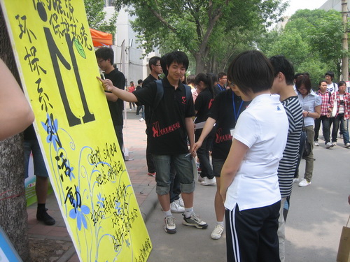 在签字仪式低碳生活环保宣传的现场,学生志愿者向过往的师生