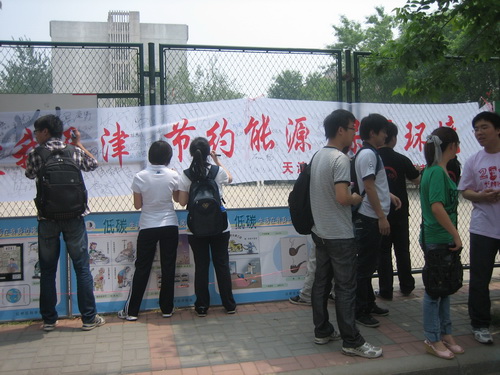 今年是天津市第二十五届科技周,本届科技周的主题是:携手建设创新型城市 ----- 科学发展 科技创新 科普惠民。产学研办公室在学校领导和红桥区科协的大力支持下,与beat365官网团委共同举办了“爱我天津,节约能源,保护环境”宣传环保系列活动。该系列活动包括以漫画展的形式向广大师生进行“低碳生活在我身边” 环保意识教育,组织观看以环保内容为主的《全国科技活动周优秀科教影片展播》光盘,并在十八日举行了“低碳生活,节约能源从小事做起、从我做起、从现在做起”签字仪式。校团委和产学研办公室负责人及老师参加了仪式并庄重承诺在宣传横幅上签下自己的名字。过往的老师和同学也纷纷宣传条幅上签字,表示了对低碳生活、节能环保的决心。