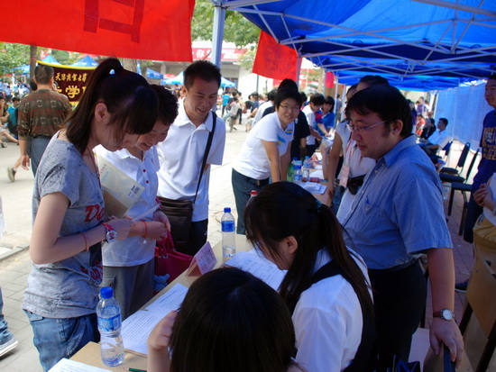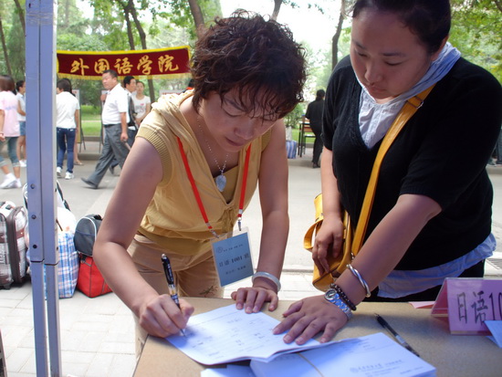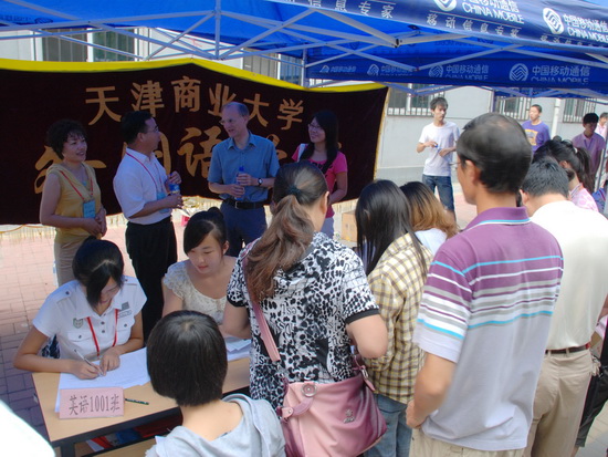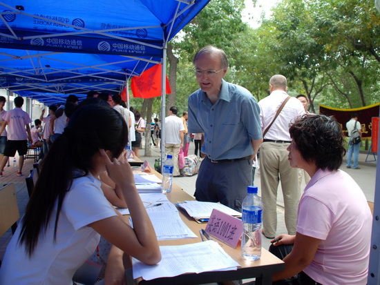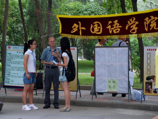 田海龙院长、副书记、辅导员及各位班主任老师早早来到了迎新现场,热情接待每一位前来报到注册的同学,耐心回答他们的每一个问题。志愿者同学们积极的帮他们运送行李、办理手续、熟悉校园环境,让他们能够顺利踏入大学的校门。外语学院的两位外教Malcolm 和兴津正信成了迎新现场的一道特殊的风景线,他们和同学热情的交谈,以自己独特的方式向来自四面八方的学子表示欢迎,受到了家长和学生的好评。