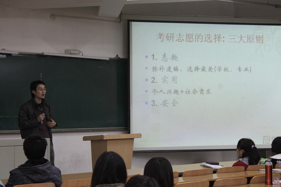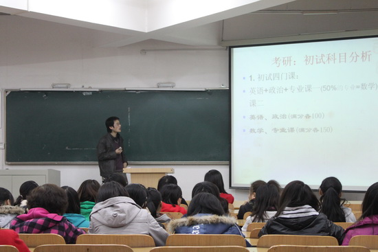 在讲座中,马老师首先介绍了研究生考试的目前形式与具体要求,并阐述了考研对改变命运的重要意义。马天艺老师指出:考研志愿的选择非常重要,可以弥补高考遗憾,重新选择理想中的高校;个人兴趣和社会需求是考研选择的重要因素;耐心与毅力是考研取胜的非智力因素。马老师不仅提出了详实的复习计划,还对考研的物质和心理准备提出了可行性建议。他不仅介绍了英语的学习计划,还介绍了数学、政治和专业课的复习计划,而且非常实用和科学。