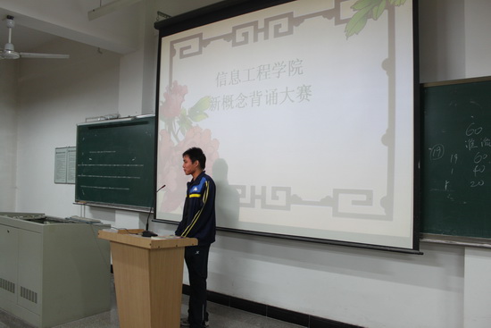 信息工程学院12月1日下午在3#202 教室开展了以“提高英语水平,展示背诵魅力”为主题的新概念背诵大赛。本次活动由许兆光老师策划,2010级助理班主任组织,信息工程学院2010级学生参加。