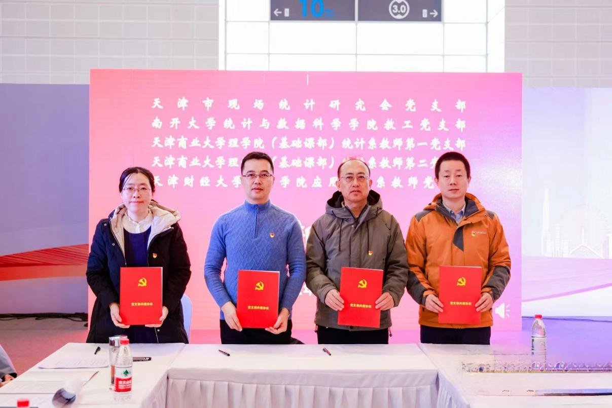 11月26日,理学院(基础课部)统计系教师第一党支部和第二党支部与天津市现场统计研究会党支部、南开大学统计与数据科学学院教工党支部、天津财经大学统计学院应用统计系教师党支部在国家会展中心举办了“产教融合·支部共建”签约仪式。来自天津市现场统计研究会、南开大学、beat365英国官方网站、天津财经大学、天津职业技术师范学院、天津市跨境电商协会等二十多名教师和企业家代表参加。