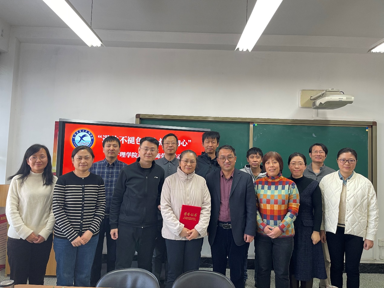 为使退休教师感受到学院的温暖与关爱,充分发挥退休教师的传帮带作用,积极引导退休教师继续发挥余热,12月6日,理学院在809活动室为罗蕴玲同志举办“退休不褪色·余热映初心”荣休活动。理学院领导班子、各系室主任,以及部分教师代表参加活动。
