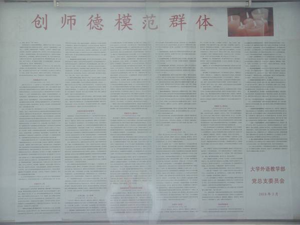 近日,为配合学校开学初宣传的加强师德师风建设活动,大学外语教学部布置了一期以“为党旗增辉添彩,创师德模范群体” 为主题的宣传栏。