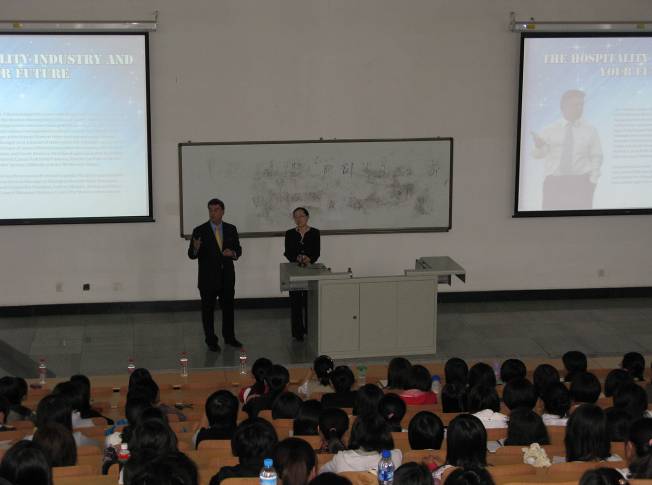 2009 级新生入学伊始,合作学院便展开了学生的职业指导工作。为了使新生尽快了解今后学习的专业及将来从事的行业,合作学院在学生刚刚入校之际开展了此次的专业讲座。 Bob Fabiano 先生与学生们分享了个人成功的经验、并通过案例、故事,使学生们了解到酒店行业发展及酒店各岗位情况及其重要性,其幽默的演讲风格和活泼的演讲形式博得在场学生的一陈阵掌声。通过此次讲座,学生们还了解成为酒店管理人才需要具备的素质及如何达到这样的目标,更重要的是,此次讲座激发了学生对于酒店管理专业的兴趣及热爱,激励学生在该专业努力学习。