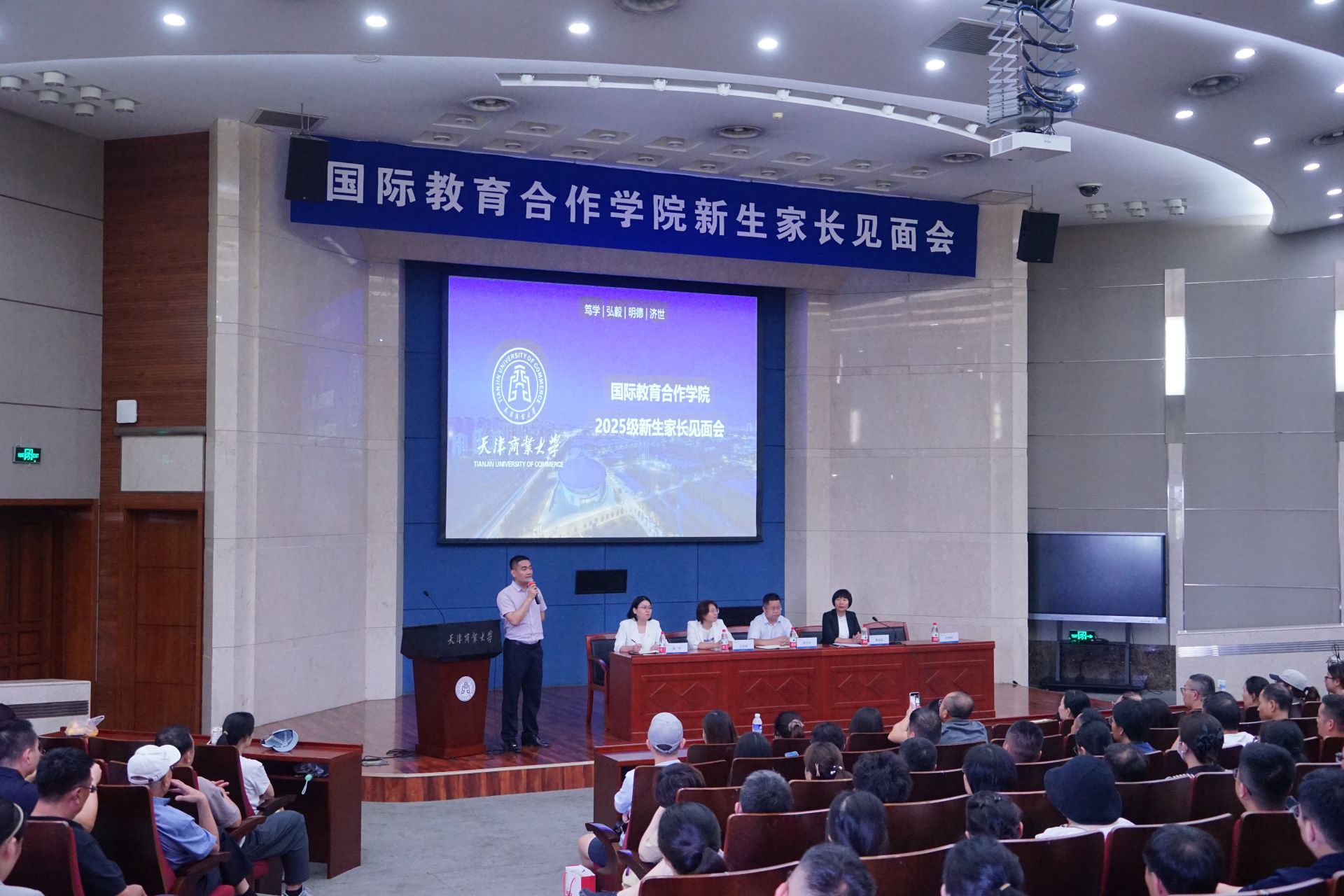 9月7日下午,国际教育合作学院在图书馆国际报告厅举办了2025级新生家长见面会。国际教育合作学院党委书记郭卫中,党委副书记、院长曹晓丽,党委副书记、纪委书记王舒婷,副院长陶伟、副院长刘辉群,以及班主任和教师代表出席。近300名新生家长参加本次活动。