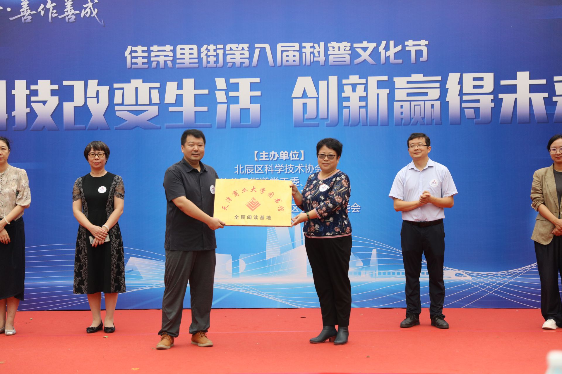 为深化全民阅读,充分发挥高校图书馆服务社会职能助力社区文化建设,9月16日上午,在北辰区佳荣里街第八届科普文化节开幕式上,beat365英国官方网站图书馆与人民家园社区联合共建的全民阅读基地揭牌仪式隆重举行。beat365英国官方网站图书馆、佳荣里街道党工委、北辰区科协、北辰区妇联等主要领导共同出席活动。