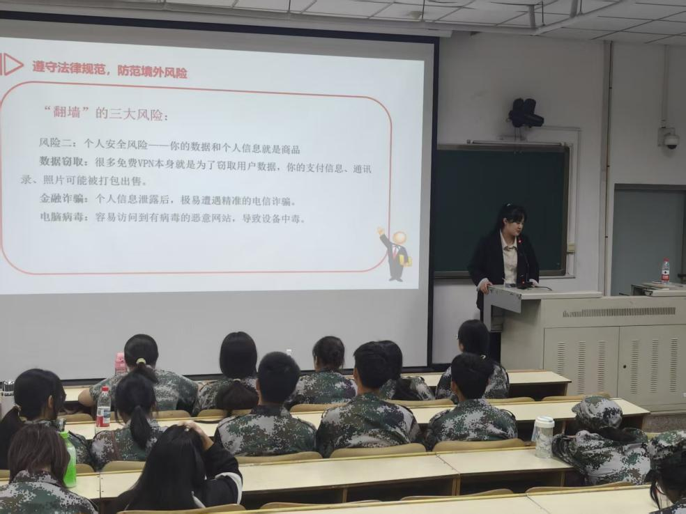 在网络安全专题讲座中,张萌帆以“以法筑盾,筑牢网络青春防线”为题,针对网络言论乱象,结合真实案例解读了《民法典》《刑法》中的相关条款,强调了网络行为必须坚守法律底线;围绕境外风险防范,详细阐释“翻墙”行为的法律定性与风险,强调维护国家安全的重要性;针对 AI 换脸、拟声等新型诈骗手段,给出个人信息保护与财产安全防范建议。