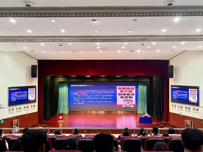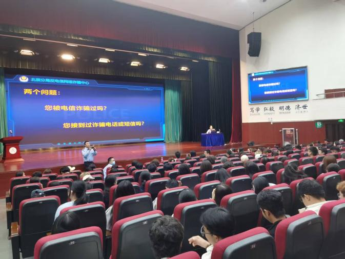 在防范网络电信诈骗专题讲座中,王旭警官通过详实数据和典型案例,向同学们解析了几种高发电信诈骗类型,揭露骗子利用“登门槛效应”,实施诈骗的心理战术,对于如何识别和防范电信诈骗给出具体方法,切实提高了同学们反诈防骗能力。
