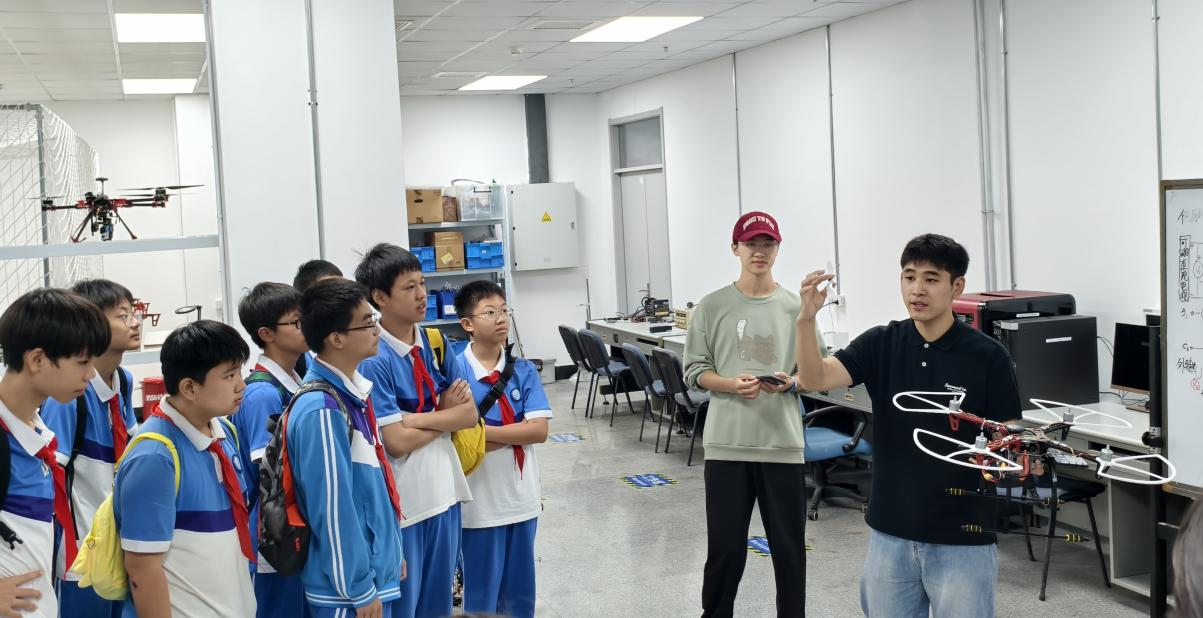 活动伊始,信息工程学院的老师带领由研究生、本科生组成的志愿者团队,以饱满的热情迎接了来访师生。在演示环节,信息与通信工程专业的研究生任洪生,凭借扎实的专业知识,向师生们详细讲解了无人机系统中通信感知技术与运动控制算法融合原理,还现场引导陆空机器人依次完成地面与低空起降巡航的切换操作,让抽象的技术原理变得直观易懂,赢得了师生们的阵阵掌声。