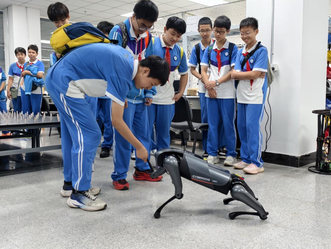 随后,人形机器人编队起舞的环节更是惊艳全场,多个人形机器人整齐划一,精准完成旋转、滚转等一系列高难度特技动作,灵活的姿态、流畅的动作,瞬间点燃了现场气氛,引发师生们的欢呼与赞叹。而机器狗互动环节,则将此次活动的气氛推向了高潮。仿生机器狗不仅展现出超强的运动能力,顺利完成连续后空翻、障碍物躲避等动作,还能精准回应“握手”“转圈”等指令。不少学生被机器狗的“聪明”与灵活吸引,纷纷围在周围,主动与机器狗握手互动,还在志愿者的指导下尝试发出简单操作指令,亲身感受科技带来的乐趣。