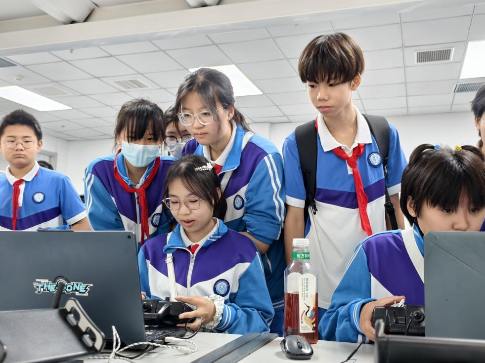 与此同时,多旋翼无人机模拟飞行体验区前也排起了长队。通信工程专业的本科生张毓良耐心细致,先向同学们讲解遥控操作逻辑与飞行姿态控制技巧,随后手把手指导初中生操控摇杆。同学们从最初操控时的手忙脚乱,到逐渐掌握技巧,成功完成多旋翼模拟起降,脸上都洋溢着成功的喜悦。
